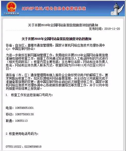 工業(yè)和信息化部將于2018年11月15日至12月10日,通過發(fā)送短信及人工電話呼叫的方式,組織開展2018年全國(guó)網(wǎng)站備案信息準(zhǔn)確性抽樣核查工作。