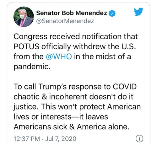 “國(guó)會(huì)收到通知,美國(guó)總統(tǒng)在全球疫情大流行期間,正式將美國(guó)從世衛(wèi)組織中撤出。”美國(guó)國(guó)會(huì)參議院外交關(guān)系委員會(huì)成員羅伯特·梅嫩德斯7月7日則稱(chēng),特朗普在新冠疫情應(yīng)對(duì)中表現(xiàn)出“混亂和前后不一”,退出世衛(wèi)組織的舉動(dòng)“不會(huì)保護(hù)美國(guó)人民的生命或利益,而是使美國(guó)人生病,使美國(guó)孤立無(wú)援”。