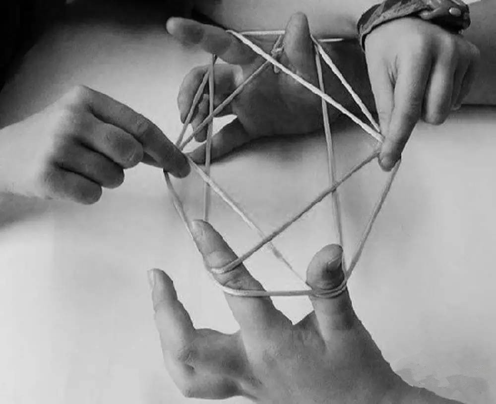 到現(xiàn)在,只要有心情,也可以用一根線打個(gè)結(jié)變身成一個(gè)好玩的工具。兩個(gè)小伙伴之間把繩子翻來翻去,變幻無窮,也樂趣無窮。