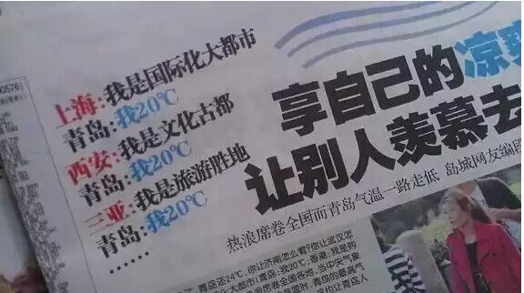 “青島:我20℃“,這是青島網(wǎng)友編的段子。2013年6月27日,這個(gè)段子經(jīng)《青島早報(bào)》報(bào)道后徹底火了,青島的清涼讓全國網(wǎng)友羨慕不已。每年一進(jìn)入6月份之后,青島網(wǎng)友就要拿出這個(gè)段子嘚瑟一番。