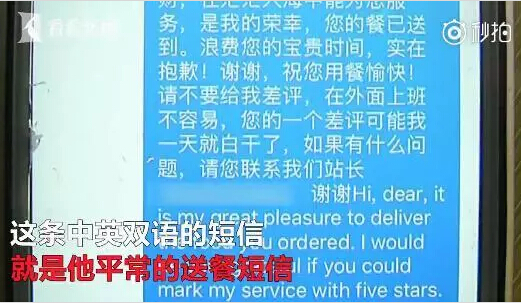 外賣小哥的送餐短信是中英文雙語的▼