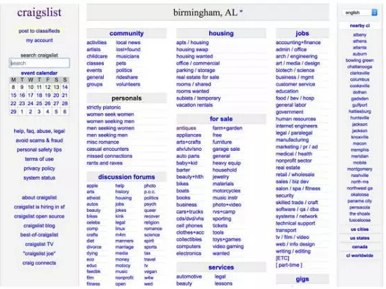 我通常用Craigslist的案例來(lái)分析。正如上圖你所看到的,這個(gè)網(wǎng)站的主頁(yè)就是一堆藍(lán)色的文字鏈,設(shè)計(jì)者把他們按照一定的分類進(jìn)行排放,這種設(shè)計(jì)就像1999年互聯(lián)網(wǎng)剛開(kāi)始興起時(shí)的風(fēng)格樣式。