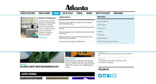 Atlanta Magazine 的大型導(dǎo)航菜單給人的體驗就非常流暢,下拉菜單中嵌入了大量的鏈接。由于響應(yīng)式的滑動導(dǎo)航在移動端上也已經(jīng)很常見了,這使得它還輕松兼顧到了移動端的設(shè)計。