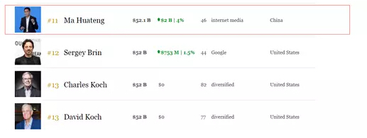 福布斯實(shí)時(shí)富豪榜數(shù)據(jù)顯示,中國首富馬化騰身家達(dá)到521億美元,已超過谷歌聯(lián)合創(chuàng)始人謝爾蓋·布林、美國科氏工業(yè)集團(tuán)的科赫兄弟,在全球富豪榜排名中攀升至第11位。騰訊今日股價(jià)再創(chuàng)新高,站上470港元,市值突破4.5萬億港元。