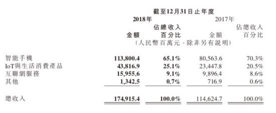 報告顯示,2018年小米手機業(yè)務收入人民幣1138億元,同比增長41.3%;IoT與生活消費品業(yè)務貢獻收入438億元人民幣,較去年同比增長86.9%;互聯(lián)網(wǎng)服務業(yè)務收入160億元,同比增長61.2%,占總體營收的9.1%。分別在總收入中占比65.1%、25.1%和9.1%。